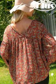 36 PLS {Cool Energy} Rust Print Smocked Top PLUS SIZE 1X 2X 3X