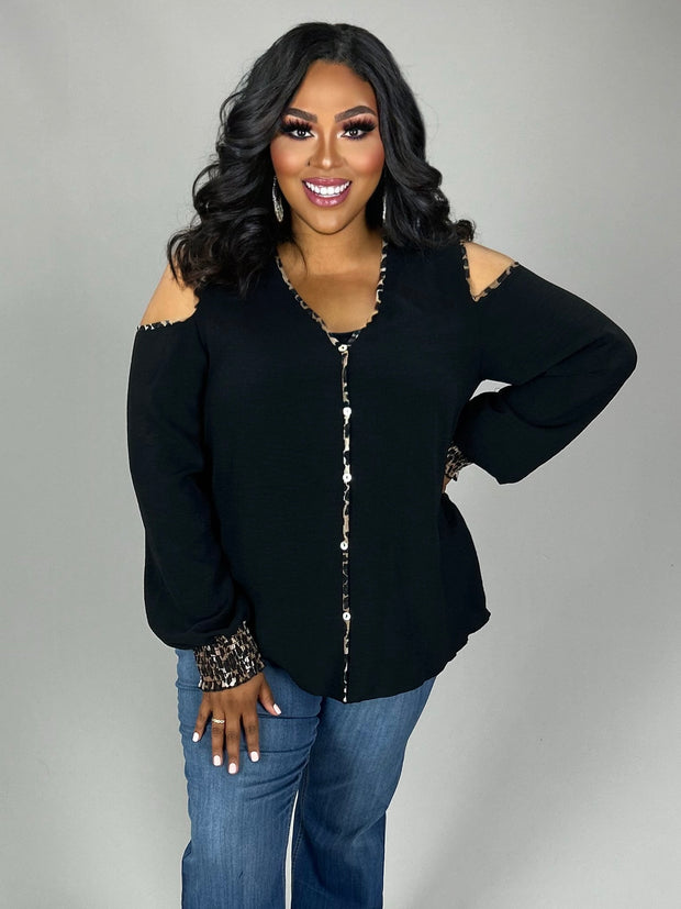 46 OS {Leopard Defined} Black Cold Shoulder Top PLUS SIZE XL 2X 3X